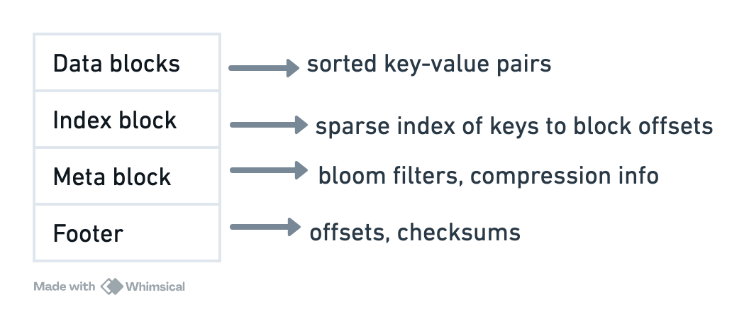 - SSTables (Immutable Sorted Files): When the MemTable fills, it’s flushed to disk as an SSTable. These files are always sorted and never modified. Each contains data blocks, an index, metadata (like Bloom filters), and a footer.